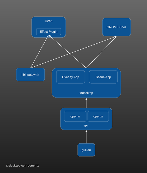 Далее разработчики написали расширение движка Vulkan, которое разрешает средам исполнения виртуальной реальности, таким как SteamVR (который работал с Linux с 2017 года), выполнять рендеринг непосредственно на очки через direct mode. Аналогичное расширение разрабатывается для Wayland, основной альтернативы X11.