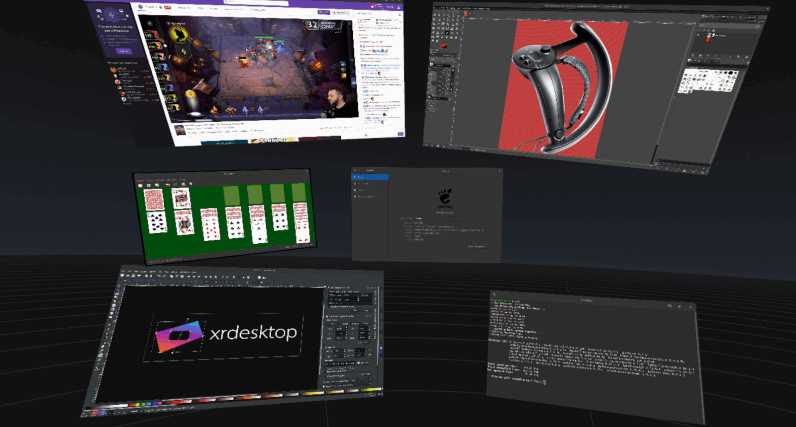 Библиотека xrdesktop стала следующим шагом. Это система управления трёхмерными окнами, которая позволяет пользователю правильно видеть и контролировать их в виртуальной реальности. Она поддерживает HTC Vive и Valve Index с драйверами для Linux. С контроллерами из их комплектов пользователь может перемещать в любом направлении, масштабировать и закреплять окна. Управление можно редактировать с помощью специального инструмента в SteamVR.