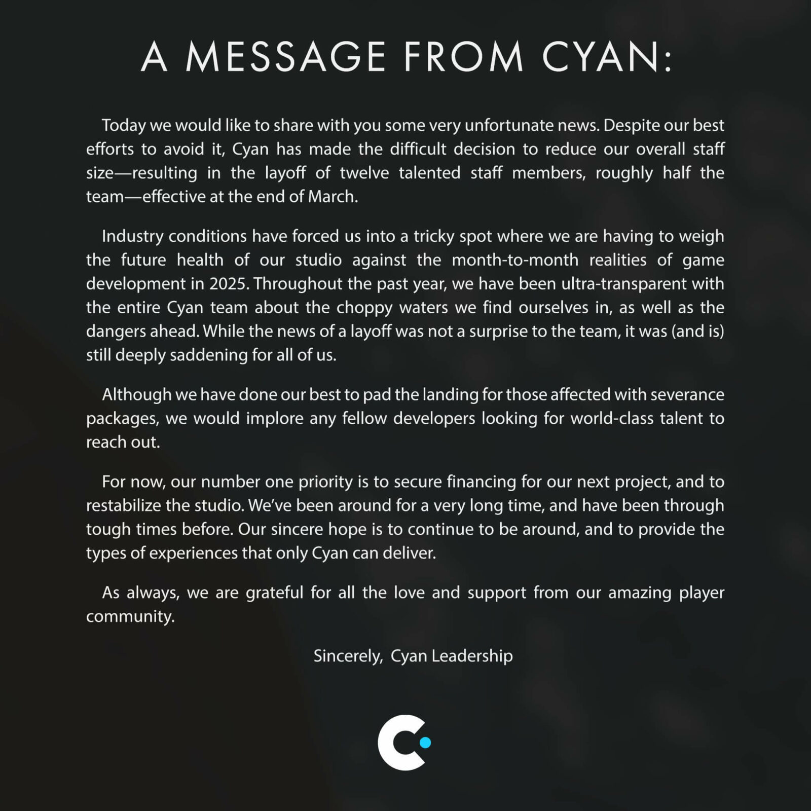 Сегодня мы хотели бы поделиться с вами некоторыми очень прискорбными новостями. Несмотря на все наши усилия избежать этого, Cyan приняла трудное решение сократить общую численность персонала, что привело к увольнению двенадцати талантливых сотрудников, что составляло примерно половину эффективной команды на конец марта.