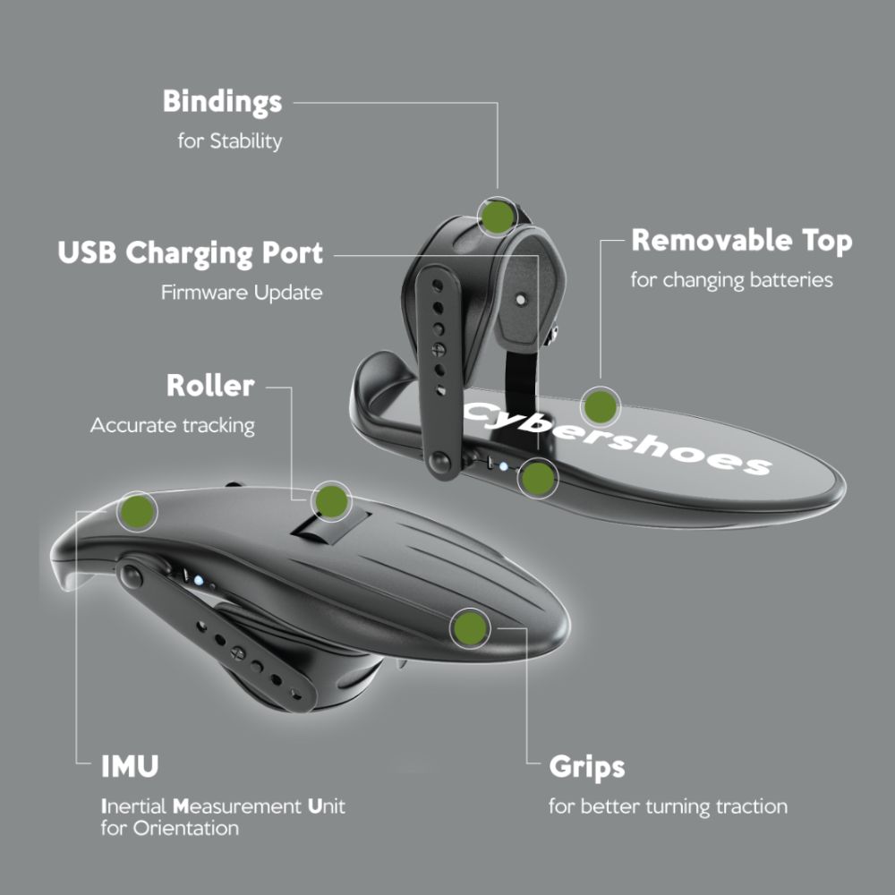 Продукция Cybershoes решала проблему синхронизации перемещения в виртуальной реальности с движениями в реальной реальности. Авторы проекта упростили ходьбу до элементарных движений ног, которые можно производить, сидя на одном месте. Это было компромиссом между дорогими всенаправленными дорожками и имитацией движения стиками и телепортацией.