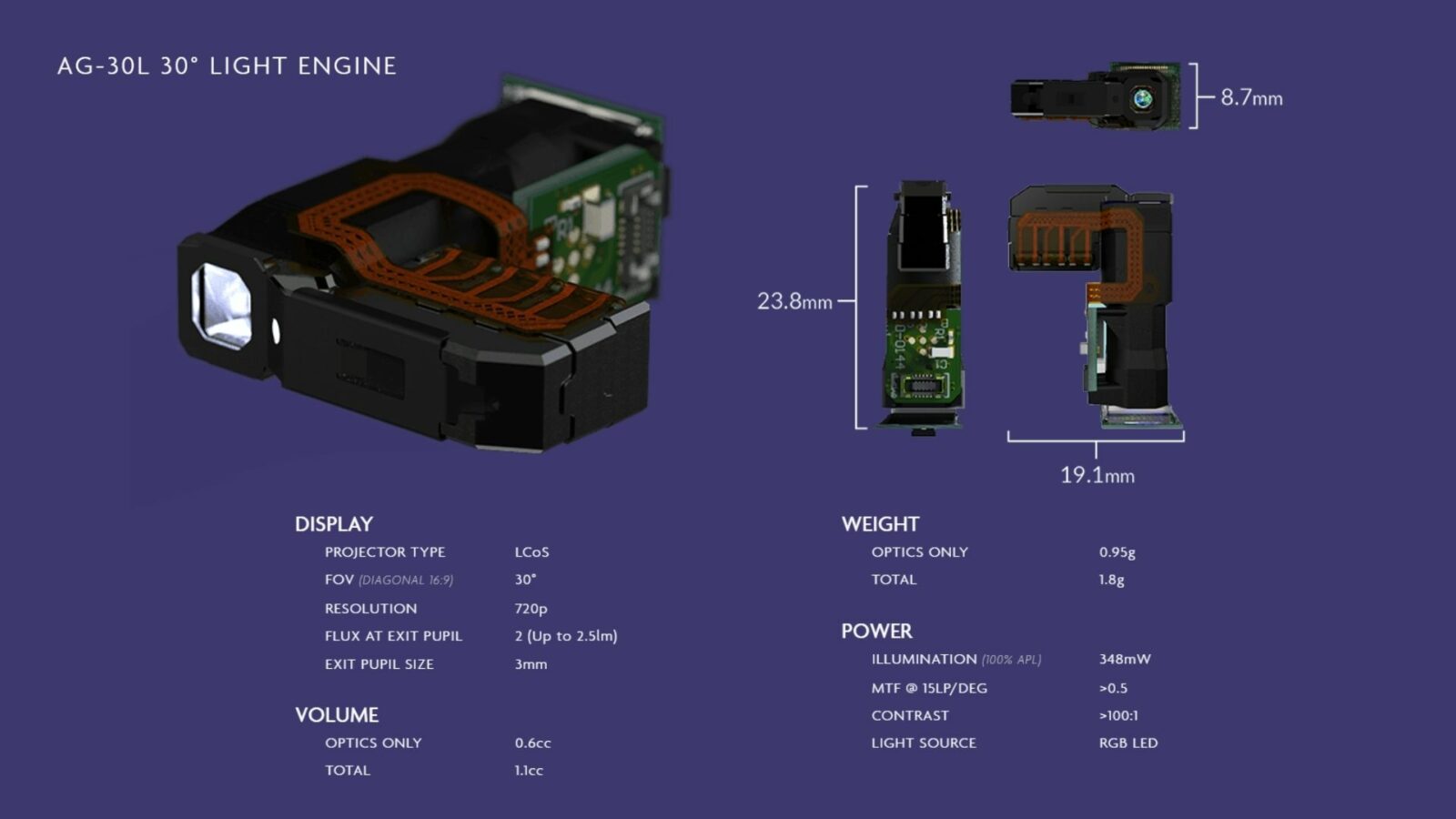 Разработчик волноводов Dispelix сообщает о партнёрстве с Avegant, поставщиком миниатюрных светодиодных LCoS-источников изображения для очков дополненной реальности. В результате финны хотят оптимизировать свои дисплеи на уровне материалов и производства под новые движки AG-30L 30°.