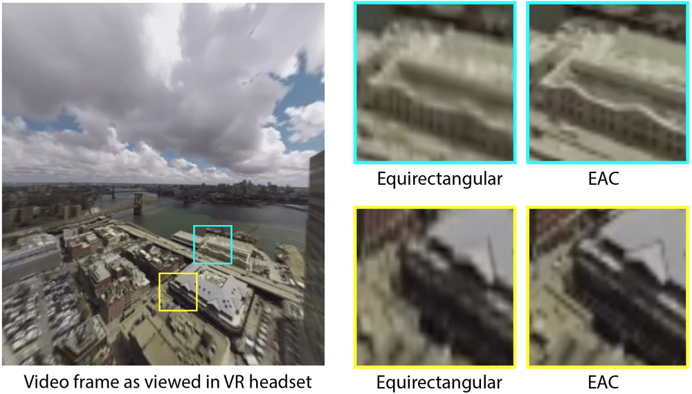 Равноугольная кубическая карта представляет собой эволюционное развитие обычной кубической карты. Различие заключается в более эффективном расположении пикселей относительно положения зрителя. В обычной кубической карте есть участки разной итоговой длины в зависимости от их места на поверхности. EAC распределяет их равномерно. Равноугольная кубическая карта позволяет строить картинку с более правильным углом перспективы в сфере. Это снижает перенасыщение пикселей на полюсах и уменьшает пропуски на экваторе. Плюс для пользователя заключается в улучшении качества потокового видео при прежней скорости соединения.
