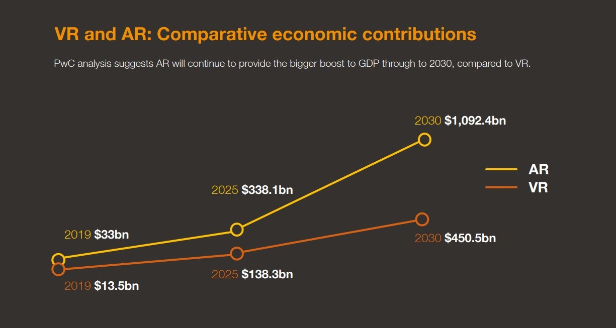 Составители документа приводят анализ рынка от PwC, согласно которому к 2030 году виртуальная и дополненная реальность могут добавить в мировую экономику около €1,3 триллиона по сравнению с €39 миллиардами в 2019 году.