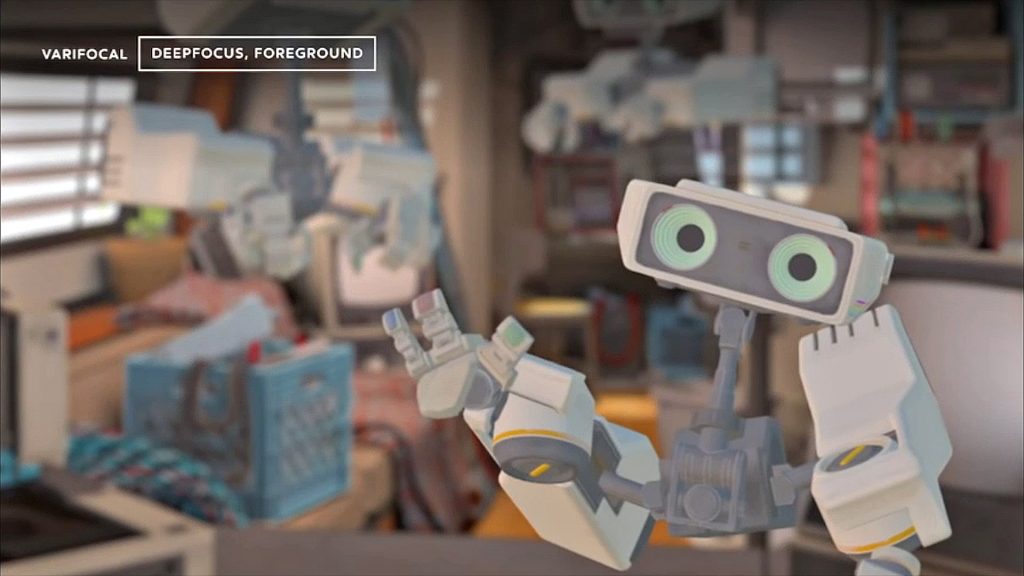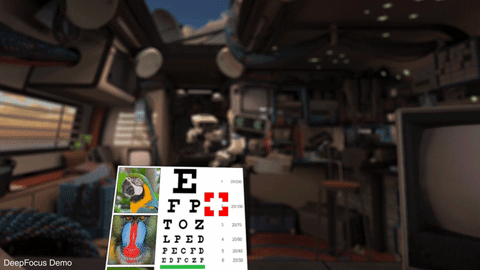 Здесь на сцене появляются варифокальные дисплеи и отслеживание глаз: первая технология имитирует разноудалённость объектов аппаратно, а вторая помогает на программном уровне. По сути, это позволяют сосредоточиться на объектах независимо от их виртуального расстояния от вас, что делает общие ощущения более комфортными и захватывающими. Но в этом пазле не хватает фрагмента — способности очков воспроизводить размытое, расфокусированное изображение. В дело вступает DeepFocus.