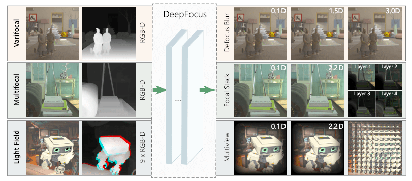 Сеть точно синтезирует размытие расфокусировки, стеки фокусировки, многослойные декомпозиции и изображения с множеством видов, используя только общедоступные изображения RGB-D и обеспечивая в реальном времени почти правильные отображения сетчаточного размытия с широким набором поддерживающих аккомодацию очков.
