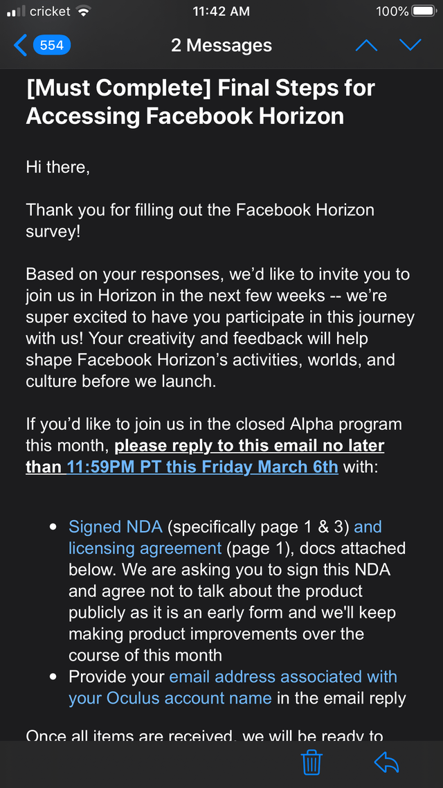 Пользователь Reddit опубликовал скриншот электронного письма, которое получил от Facebook. Оно содержит приглашение в альфа-версию, которая откроется в марте. В компании также отметили, что участие в альфа-тесте требует подписания договора о неразглашении. Письмо даёт право на тестирование в течение месяца.