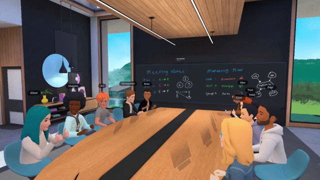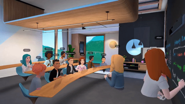 В приложении несколько типов комнат и приспособлений, ориентированных на разные варианты встреч. Есть стол в стиле зала заседаний с креслами по двум сторонам, круглый стол и презентационный сеттинг, в котором все смотрят в одном направлении, как в классе. По мере присоединения пользователей стол увеличивается.