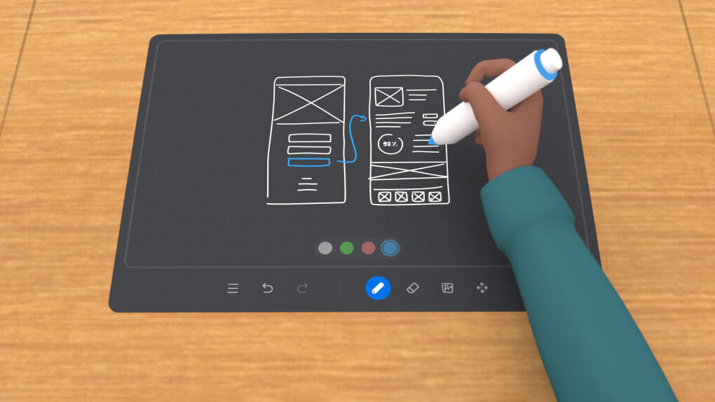 По умолчанию люди сидят за столом, но каждый может встать (буквально встать со стула) и перенестись к стене, к большой виртуальной доске. Это особенно полезно для организации уроков и докладов, так как дает каждому представление о говорящем и его презентации.