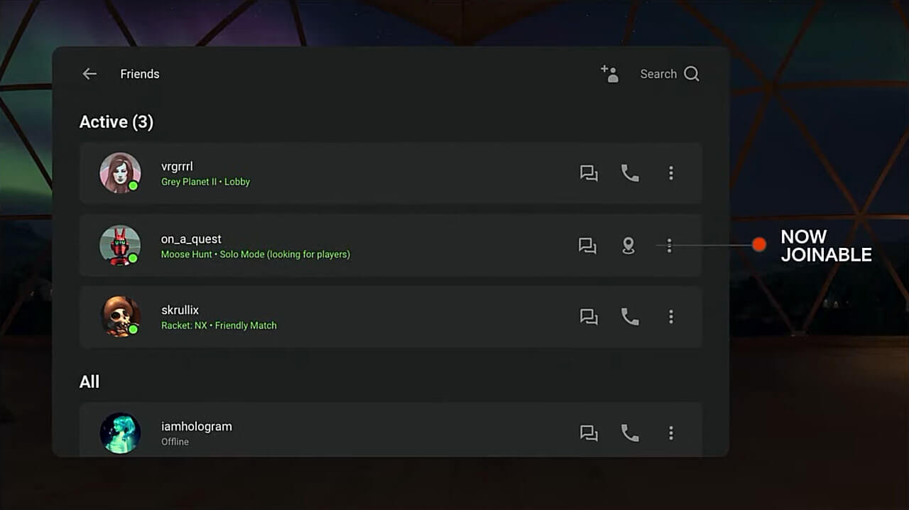 Например, приложения могут говорить платформе Oculus, что вы в одиночной игре, но ищете компаньонов для многопользовательской. Эта информация появится в списке друзей. А если вы уже начали матч, приложение может показать, что в матче осталось две минуты, и вас можно приглашать куда-нибудь ещё.