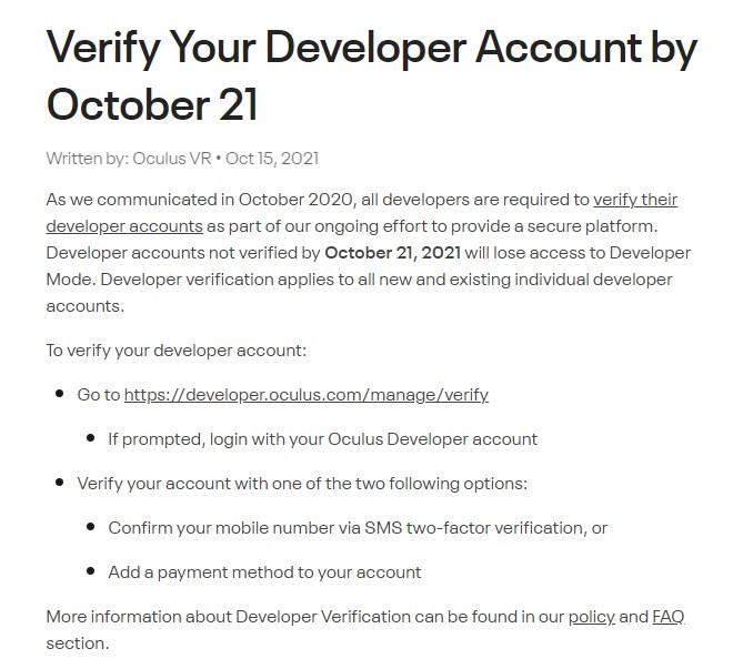 Для загрузки приложений, неопубликованных в Oculus Store, нужно включать режим разработчика, а для этого необходимо было объявить себя таковым и принять Условия использования Oculus для разработчика. Теперь же требуется также подтвердить учётную запись с помощью SMS или данных платёжной карты.
