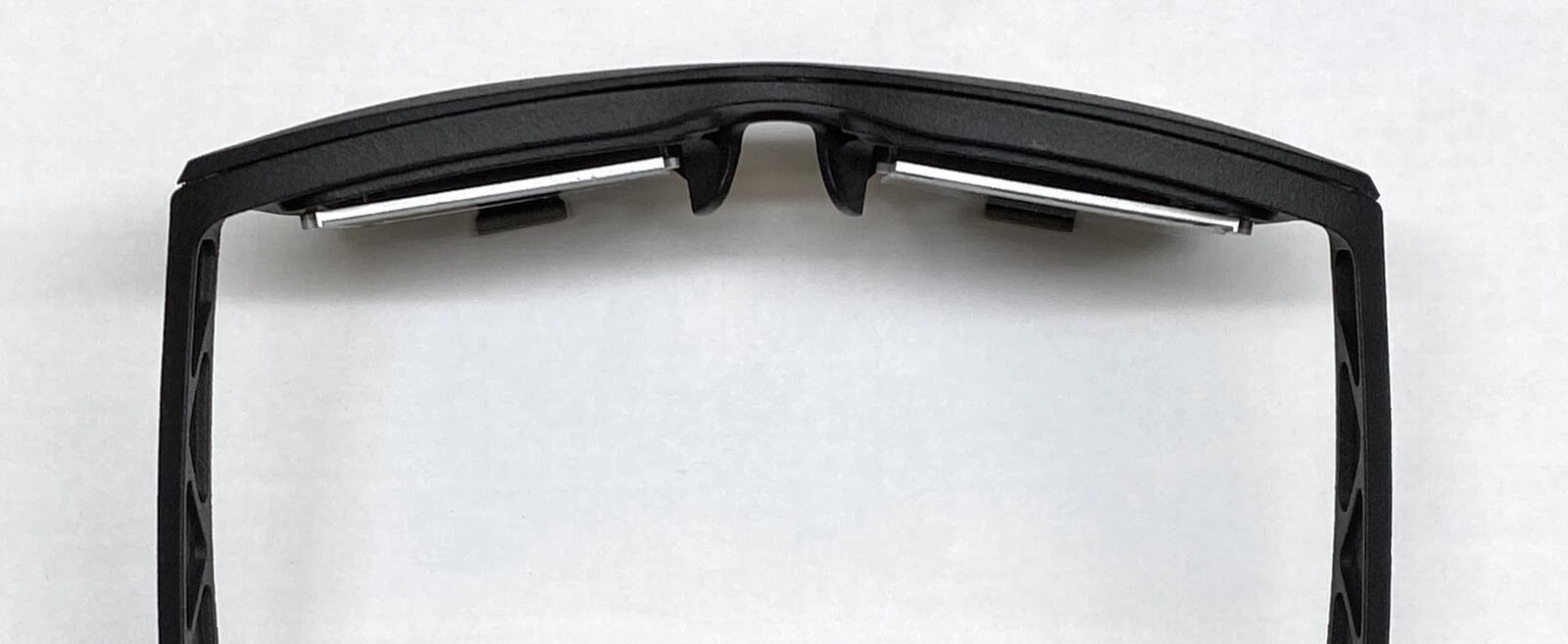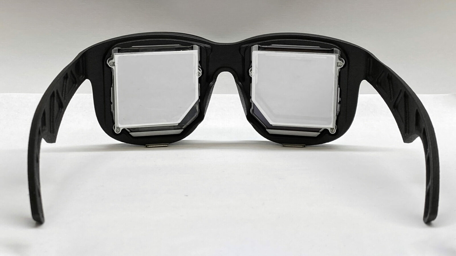 На этом изображении показаны модули дисплея исследовательского устройства, смонтированные в оправе. Это исследовательское устройство использовалось для захвата зелёного изображения, показанного ниже. Некоторые компоненты расположены вне основного корпуса.