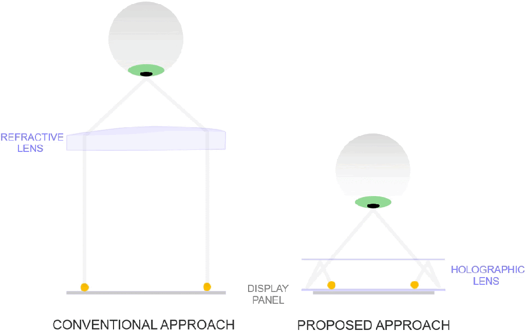 Применение голографической оптики к ВР-дисплею, говорят учёные, требует нового проектирования всех остальных оптических компонентов. Примечательно, что голографическая оптика вынуждает использовать лазерные источники света, которые сложнее интегрировать, но которые обеспечивают гораздо более богатый набор цветов, чем стандартные сегодня светодиоды.
