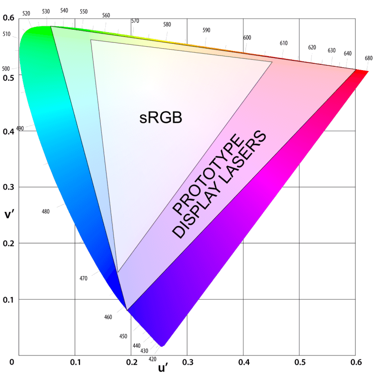 Обычным набором цветов, воспроизводимым на многих дисплеях сегодня, является цветовое пространство sRGB (показано меньшим треугольником). Обратите внимание, что оно может захватывать только небольшую часть цветов, которые мы способны различить. Напротив, внешний треугольник представляет собой гораздо больший набор цветов, которые можно воспроизвести с помощью лазеров на одном из наших дисплеев-прототипов из исследования.
