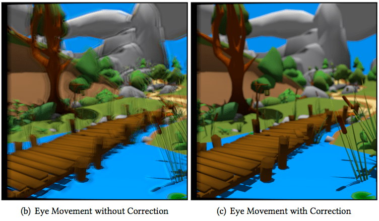 Под плоскостью отображения подразумевается фрагмент визуализированной сцены с одной глубиной фокуса. С точным отслеживанием глаз и созданием нескольких независимых плоскостей отображения, каждая из которых взята из разных областей переднего и заднего фона, вы можете имитировать ретинальное размытие. Тестовый стенд Oculus Research позволяет продвинуться дальше.