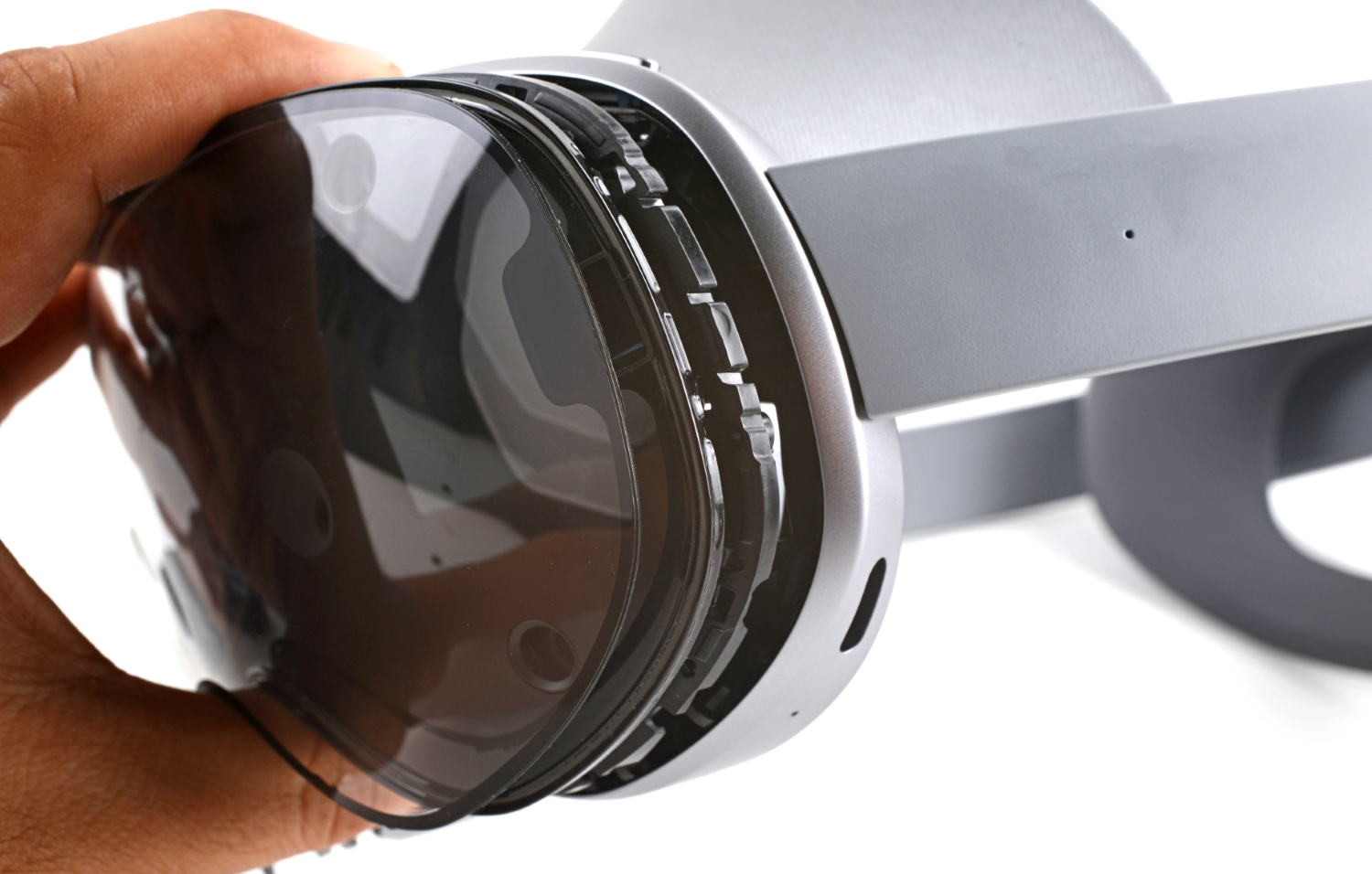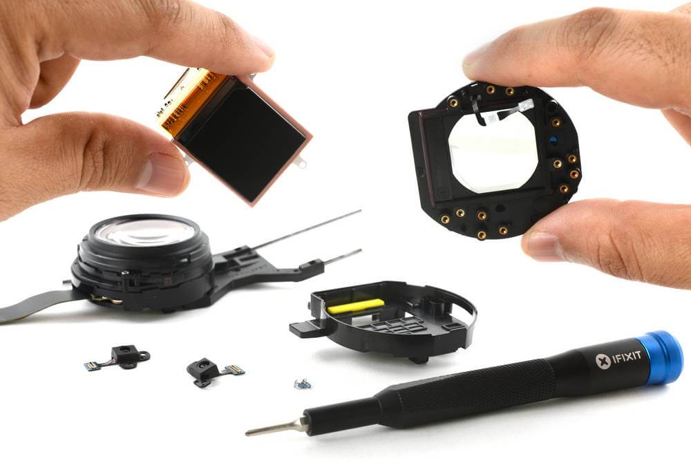 Несмотря на наклейку, внутреннее устройство очков на удивление модульное, то есть располагает к ремонту. Инженеры предпочли бы видеть камеры и датчики, которые легко менять по отдельности. Зато рама, на которой они зафиксированы, упрощает доступ к внутренним компонентам.