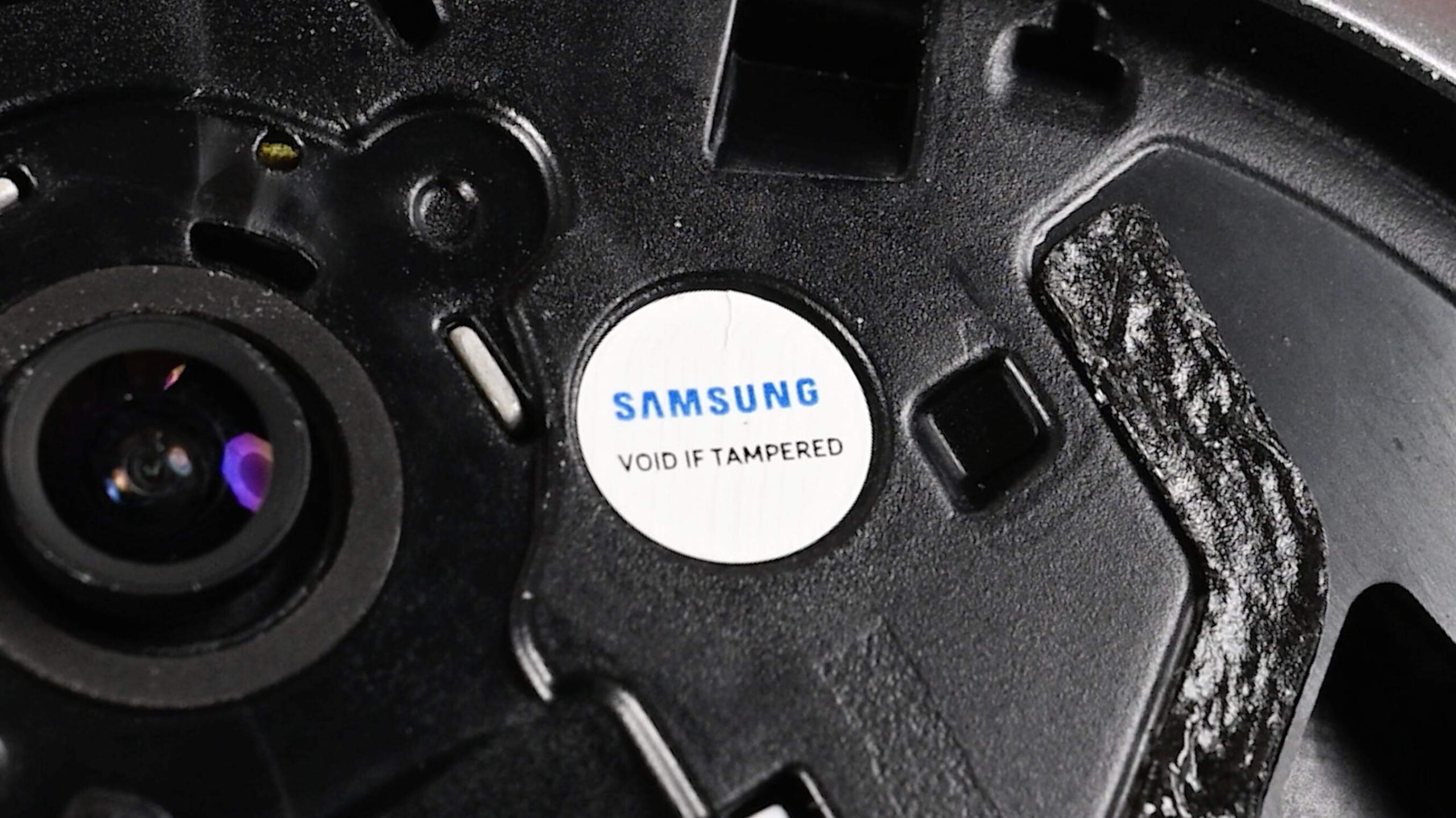 Внутри бросается в глаза наклейка типа «гарантия аннулируется, если её снять». Она закрывает винт. Это не только раздражает, но и незаконно на главном целевом рынке Samsung, США, с момента принятия в 1975 году закона Магнусона-Мосса. Он гласит, что компания не может обусловливать гарантию тем, открывал ли владелец устройство, ремонтировал его или обращался за ремонтом к третьей стороне.