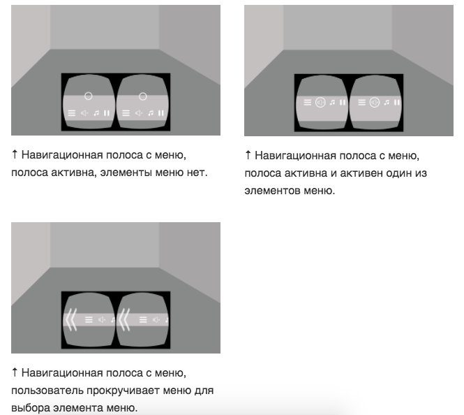 Помимо навигационных полос, размещать меню можно на объектах в виртуальном пространстве. В отличии от навигационных полос, меню на объектах не будут двигаться вслед за взглядом пользователя.
