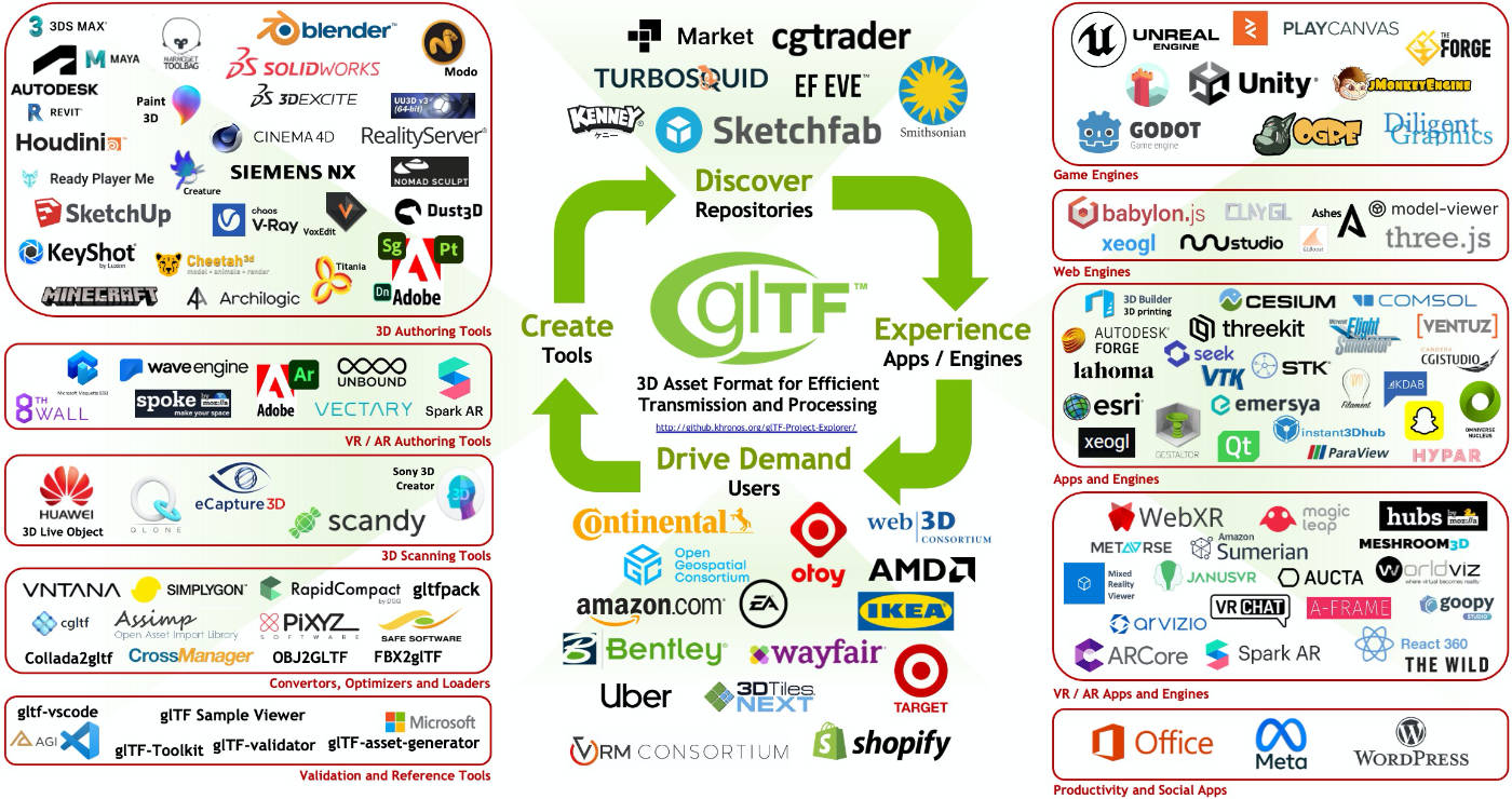 Бизнес-консорциум Khronos Group выпустил спецификацию файлового формата glTF 2.0 для передачи и загрузки 3D-моделей в качестве международного стандарта ISO/IEC 12113:2022. Стандартизация в открытом виде должна укрепить позиции glTF и ускорить его принятие отраслевыми организациями.