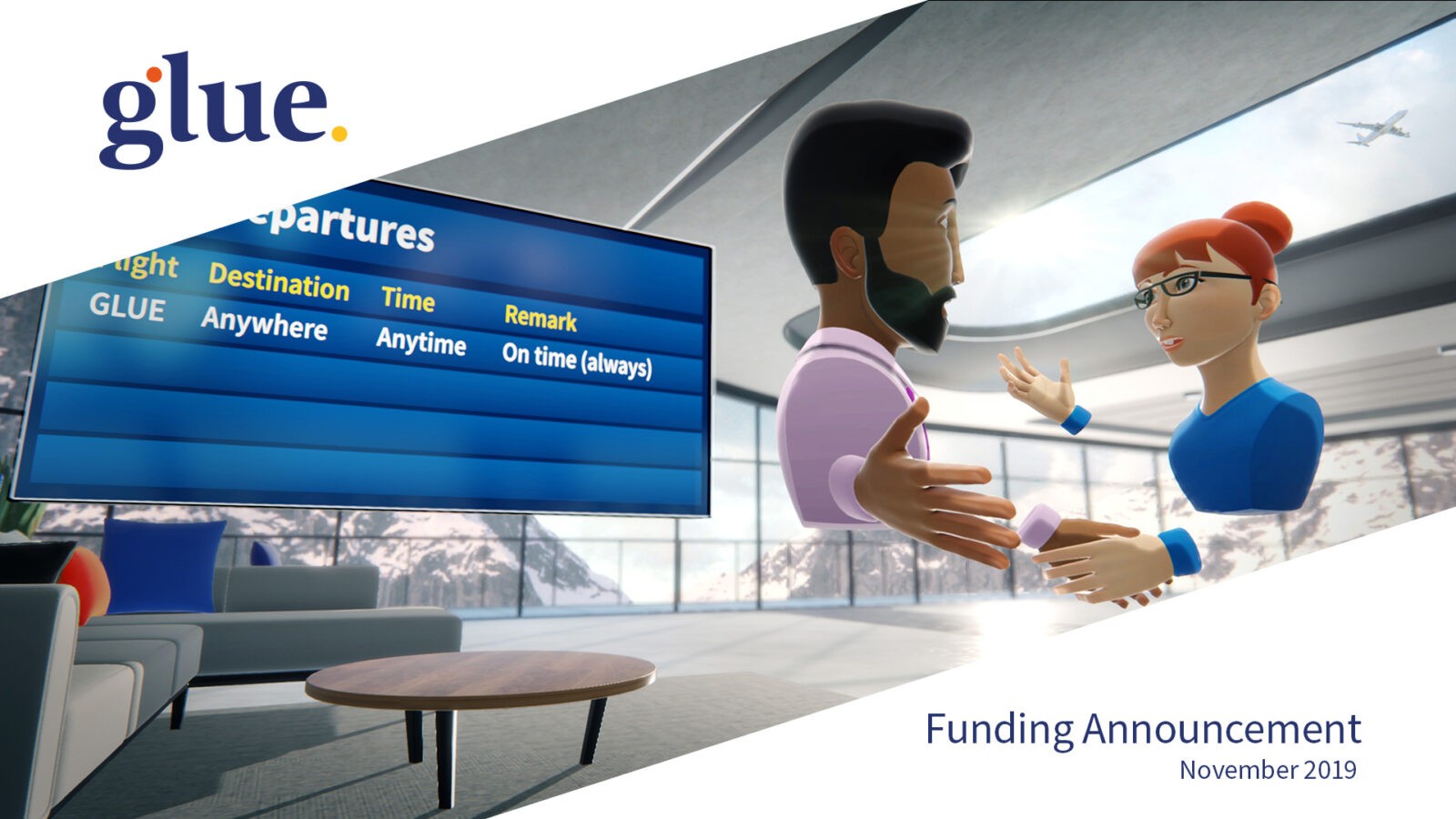 Glue — это облачная платформа, которая обеспечивает рабочие встречи в виртуальной реальности. Это альтернатива дорогостоящим физическим встречам, особенно тем, для которых приходится летать в другие страны. Одним из главных достоинств решения представители компании называют снятие коммуникационных барьеров, которые препятствуют эффективному сотрудничеству между разрозненными командами, ощущение присутствия среди коллег, способность видеть, слышать, касаться аватаров и предметов и управлять ими.