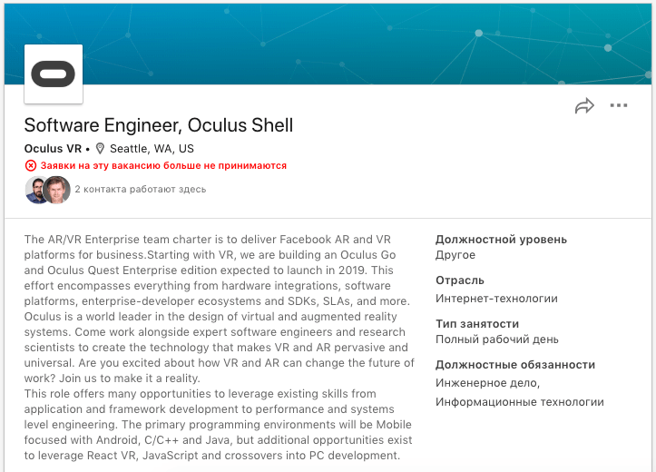 Эта информация, будучи опубликованной с корпоративного аккаунта Oculus, в подтверждении не нуждалась, сомневающиеся журналисты всё же запросили и получили его у представителя Facebook. В вакансии также делается акцент на дополненной реальности: компания ищет специалиста, который будет создавать технологию, делающую виртуальную и дополненную реальность «повсеместными и универсальными».
