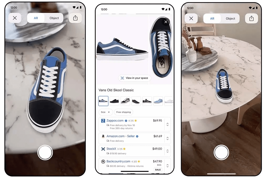 Поисковая система Google получила больше возможностей работы с трёхмерными моделями и дополненной реальностью в выдаче. Начиная с рынка США в поиске по товарам появились 3D-изображения кроссовок. Покупатель может увеличивать модели, вращать и включать режим допреальности, чтобы увидеть их рядом с собой — но не на себе, примерять обувь пока нельзя.