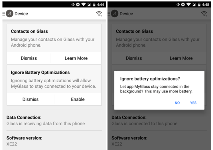 Иногда приложения должны работать вне правил, устанавливаемых Android, поэтому разработчики могут сделать запрос к операционной системе (которая, в свою очередь, спрашивает пользователей), чтобы убрать ограничения и обеспечить более агрессивное использование батареи. Так как Wear и Glass требуют постоянных беспроводных подключений, они попадают под ограничения.
