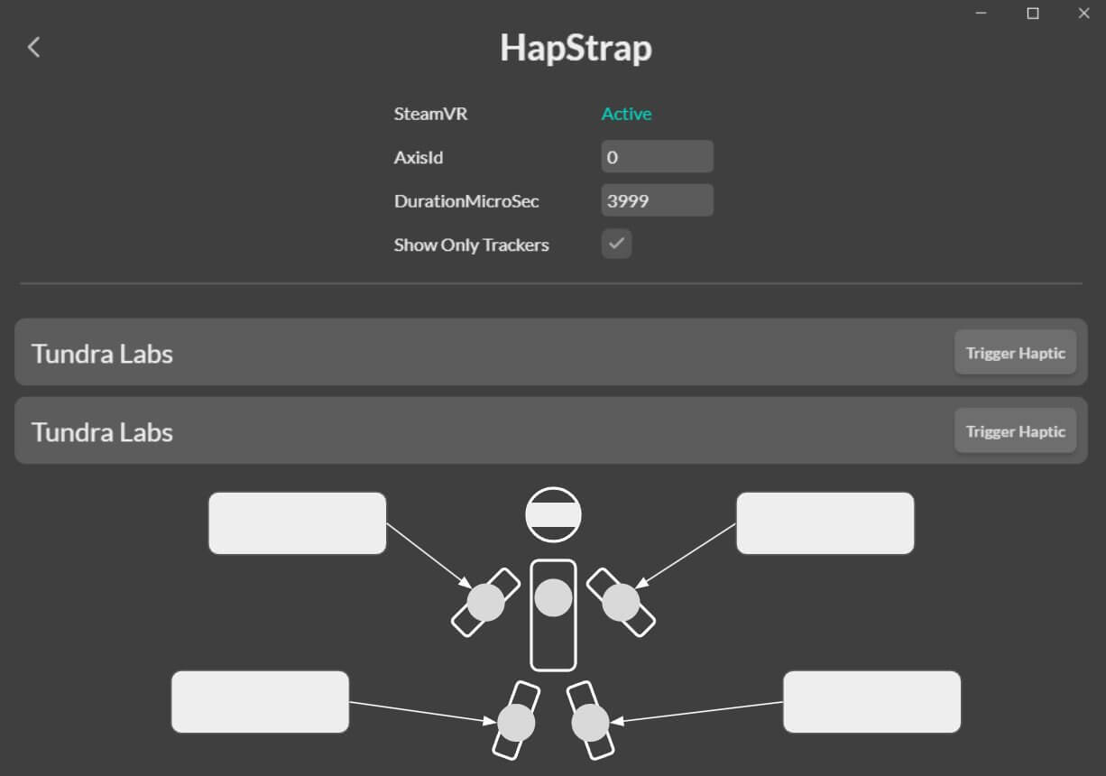 Из коробки HapStrap совместим с социальными платформами VRChat и Resonite. Трекер передаёт сигнал на гаджет, в котором есть вибромотор и аккумулятор. На компьютере работой отдачи управляет специальная программа с возможностью настройки и просмотра информации о состоянии устройства.