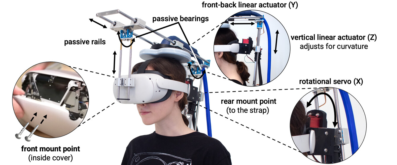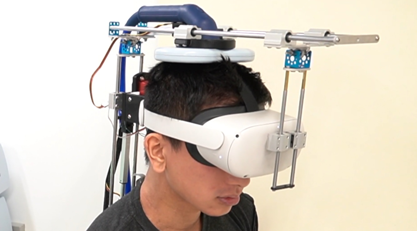 Надевать нужно только одно устройство — на голову. Прототип представляет собой дополнение к очкам виртуальной реальности, похожее на 3D-принтер с перемещающейся головкой-стимулятором. Он работает на принципах транскраниальной магнитной стимуляции (ТМС) — неинвазивного метода, при котором электромагнитные импульсы безопасно и без подкожного введения стимулируют нужные части мозга.