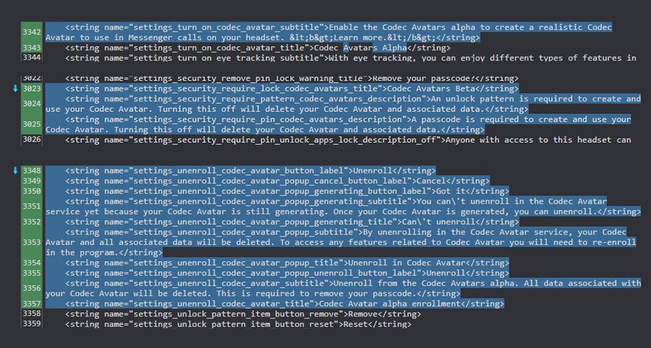 Наконец, в коде много новых строк для Codec Avatars, проекта реалистичных аватаров Meta*, которые должны составить конкуренцию Персонам из visionOS. Слухи говорят, что одним из первых приложений с поддержкой таких аватаров может стать Messenger с его видеозвонками.
