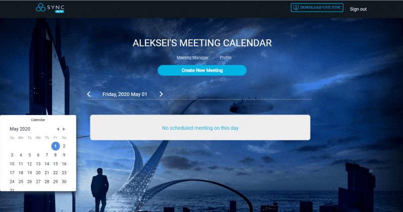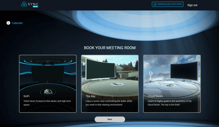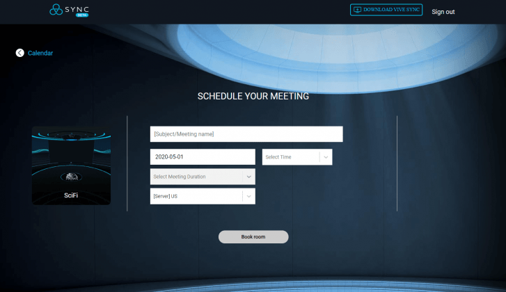 Организовать встречу в Sync можно и без загрузки клиента — через сайт sync.vive.com. Для этого нужно выбрать одну из трёх локаций, ввести дату, время, длительность и другие параметры встречи, а затем вам выдадут QR-код, логин, пароль и ссылку на выбранную комнату, которой можно поделиться, как угодно.