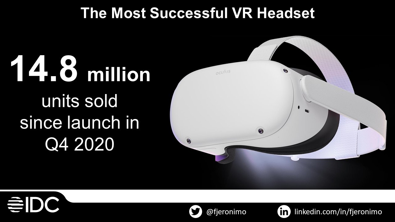 Вице-президент аналитической компании IDC по устройствам в регионах Европы, Ближнего Востока и Африки Франсиско Джеронимо (Francisco Jeronimo) дал в Twitter заключение о количестве проданных Quest 2 — величине, которая оказывает влияние на ВР-разработчиков по всему миру. Статистике нельзя доверять абсолютно, поскольку она не подтверждена официально, но в отсутствие данных от производителя это хоть какая-то опора.