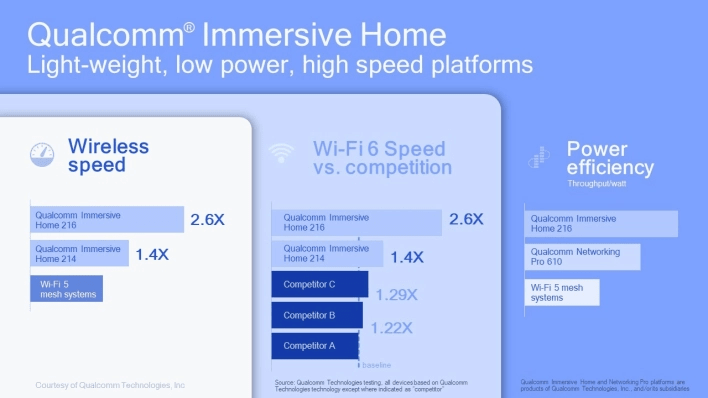 - Qualcomm Immersive Home 318 — это восьмипотоковая трёхдиапазонная платформа в конфигурации для 2,4 ГГц, 5 ГГц и 6 ГГц с общей доступной скоростью 7,8 Гбит/с. Платформа также поддерживает каналы 160 МГц в диапазонах 5 и 6 ГГц и конфигурацию Wi-Fi 6E.