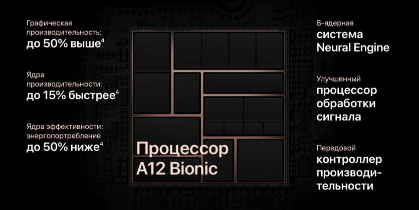 Все смартфоны базируются на новой системе на чипе Apple A12 Bionic с шестиядерным центральным процессором (2 мощных + 4 маломощных ядра), а также четырёхъядерным графическим процессором.