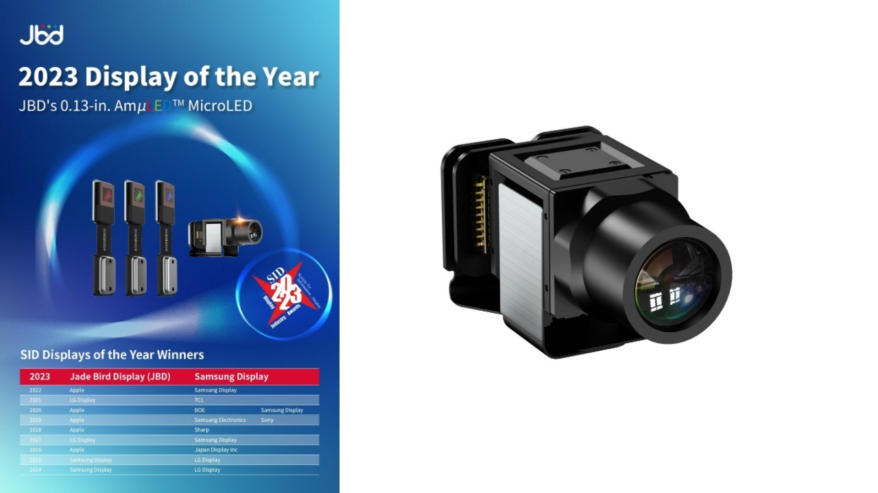 MicroLED-дисплей от JBD — это источник изображения диагональю 0,13 дюйма под брендом AmµLED. В монохромном исполнении его плотность достигает 6350 пикселей на дюйм при разрешении VGA. Несмотря на небольшой форм-фактор, микродисплей обеспечивает высокие уровни яркости: 0,75 миллиона нит для красного, 5 миллионов нит для зелёного и 1 миллион нит для синего света.