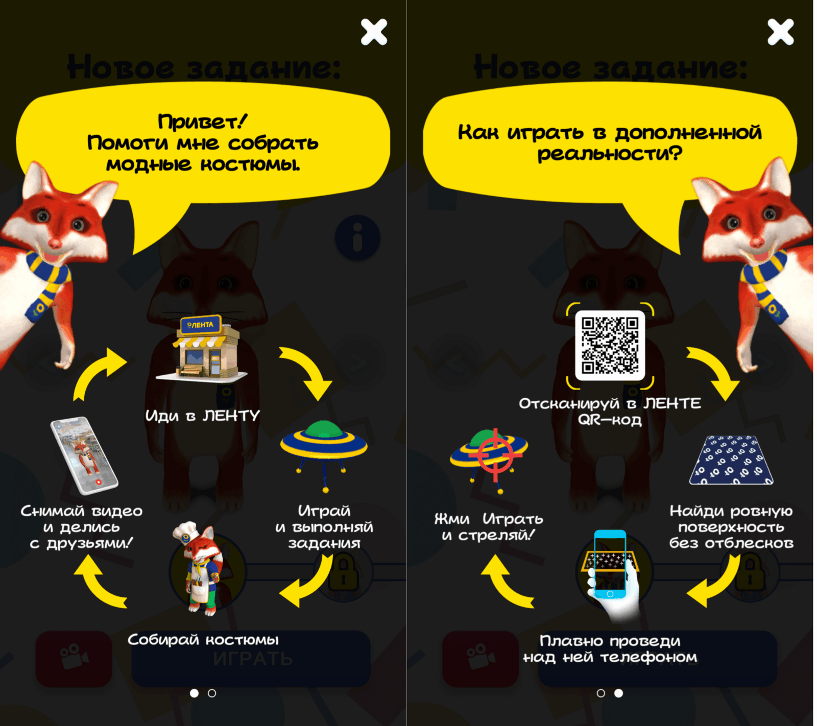 Российская розничная сеть «Лента» выпустила приложение дополненной реальности. Это игра, в которой, в отличие от проекта Магнита, нет призов и известной франшизы, зато есть весёлая задумка. Вам предстоит приодеть харизматичного Лиса, выполняя задания в супермаркетах.