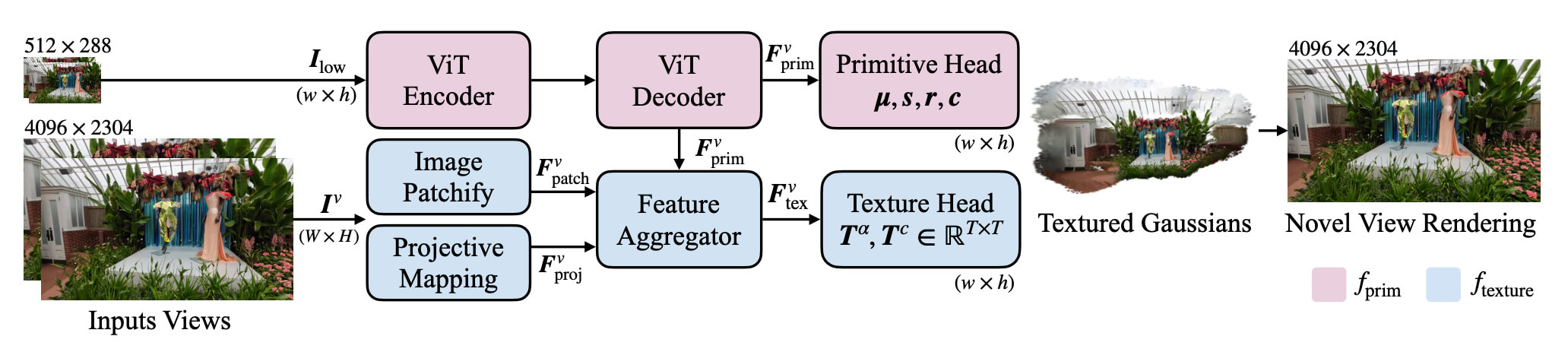 Для решения этих задач команда предложила нейросетевую архитектуру LGTM (Less Gaussians, Texture More — меньше гауссиан, больше текстуры). Это модель прямого распространения, которая предсказывает гауссовы текстуры для синтеза новых изображений высокого разрешения. Основная идея в разделении предсказания геометрических параметров и предсказания текстур на уровне примитивов с помощью двухсетевой архитектуры.