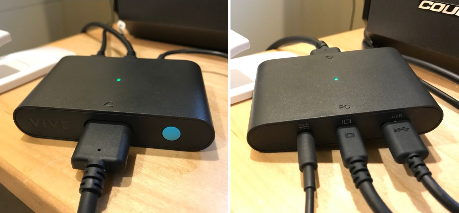 В Vive Pro тайваньцы покончили со схемой «три входа — три выхода». В старых адаптерах на стороне компьютера были разъёмы питания, USB и HDMI/DisplayPort, а на стороне шлема — питание, USB и HDMI. В Link Box для Vive Pro к шлему ведёт один кабель. На фото вы также заметите удобную синюю кнопку питания и отсутствие HDMI, который был полностью заменён открытым стандартом Mini DisplayPort. Учитывая, что большинство совместимых графических карт имеют несколько выходов DisplayPort, это изменение не должно стать препятствием для конечного пользователя.