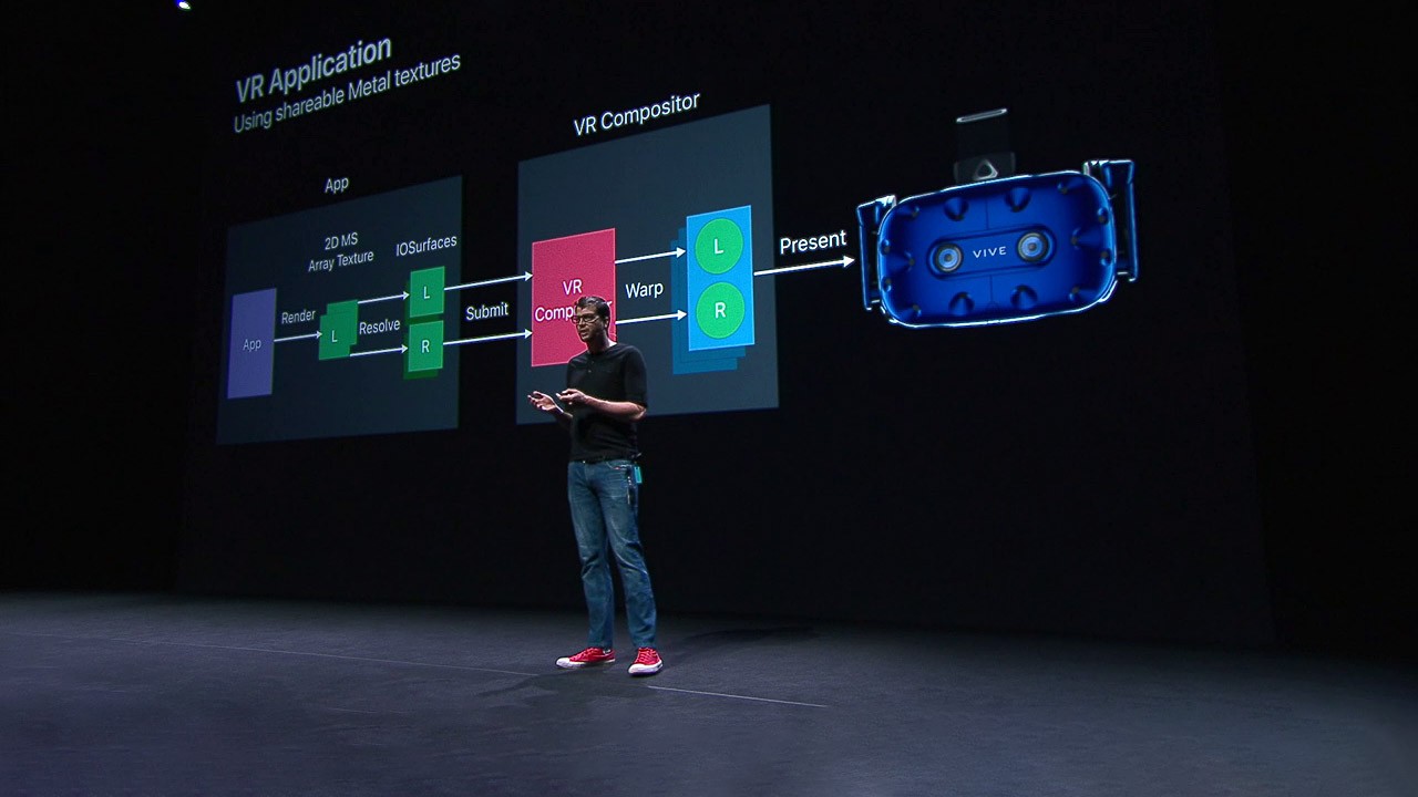 На минувшей конференции WWDC 2018 представитель группы разработчиков архитектуры программного обеспечения для графических ускорителей в Apple Кароль Гасиньски (Karol Gasiński) рассказал о новых функциях операционной системы macOS Mojave для работы с виртуальной реальностью и максимальной поддержке Vive Pro.