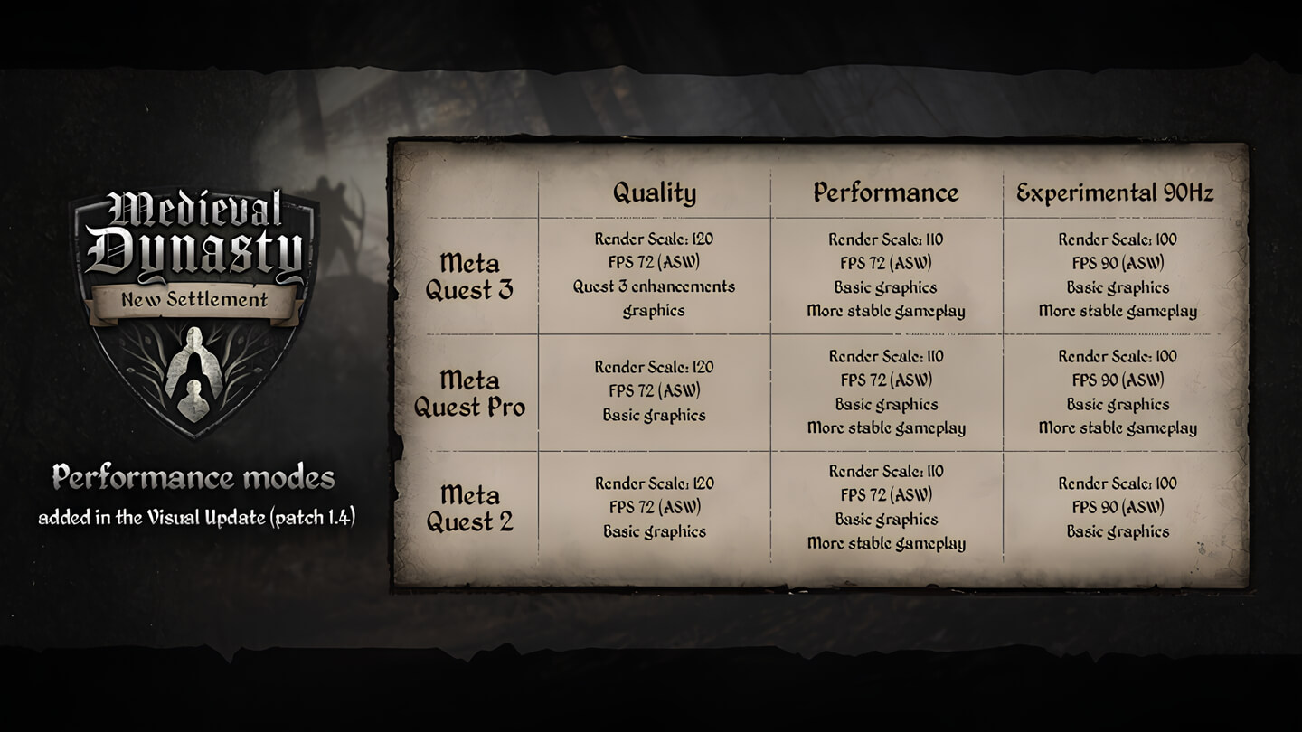Medieval Dynasty New Settlement вышла в марте и продолжила историю успешной игры на новой платформе с полным погружением. Это «песочница» с сюжетом и возможностью построить процветающее поселение, своё дело и собственную династию посреди средневековой природы. Свежее обновление 1.4 оптимизировало игру для более мощных очков Quest 3. Благодаря этому появилось множество визуальных улучшений режимы производительности на всех поддерживаемых Quest.