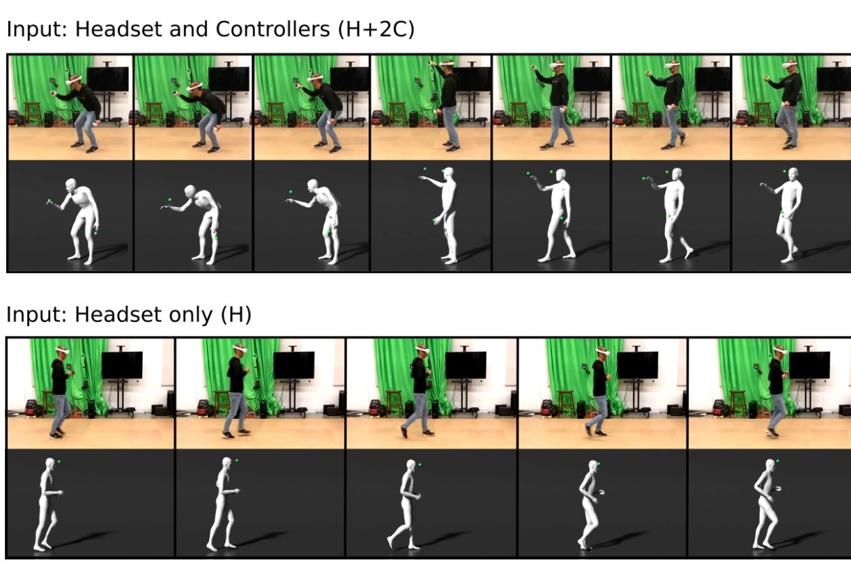 В новой статье учёные Meta рассказали о системе из Quest 2 и контроллеров, которая может вычислять правдоподобную позу всего тела без внешних датчиков. Система делает выводы с помощью нейросетей из небольшого набора данных.