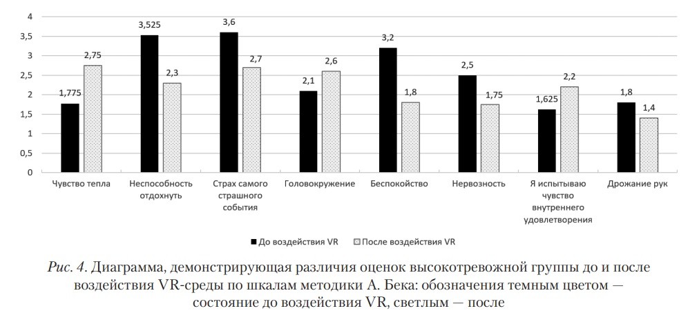 Положительная динамика также выявлена в оценке испытуемых по методике А. Бека. Участники с сильной тревожностью после виара чувствовали приятное ощущение тепла в теле, смогли отдохнуть, не испытывали страха. У них понизился уровень беспокойства и нервозности, повысилось ощущение внутреннего удовлетворения и улучшилась координация рук. Отрицательным фактором выступило то, что испытуемые ощущали лёгкое головокружение.