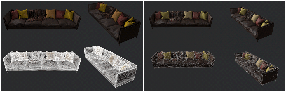 В качестве примера: приведённая выше левая трёхмерная модель дивана была построена из 584 000 полигонов. Чтобы отобразить этот контент на устройстве с более слабым графическим процессором, Simplygon оптимизировала его до 5000 полигонов, что значительно уменьшает размер файла, сохраняя при этом идеальную визуальную точность для предполагаемого устройства.