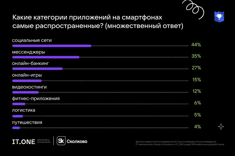 Интересно оценочное суждение разработчиков о распространённости приложений — не абсолютные данные статистики, а представления специалистов о ситуации. Наиболее популярными респонденты считают социальные сети (44%), мессенджеры (35%) и банковские приложения (27%). Игры (15%) и видеохостинги (12%) заняли четвёртую и пятую строчку соответственно. Наименее популярной категорией приложений российские разработчики сочли путешествия (4%).