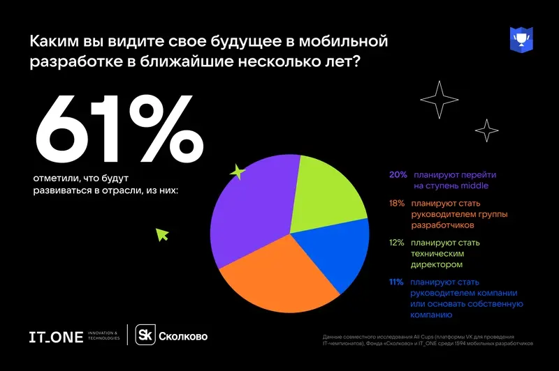 Аналитики платформы чемпионатов среди программистов All Cups от VK, Фонда «Сколково» и компании IT_ONE провели опрос 1594 разработчиков в рамках чемпионата IT_ONE Cup. Mobile, который проходил с 31 марта по 16 апреля 2023 года. 43% специалистов считают мобильную разработку наиболее перспективным направлением. 34% отмечают, что в будущем большинство операций будет осуществляться в виртуальной и дополненной реальности. Еще 10% уверены, что приложения для ПК останутся самыми востребованными у пользователей. 7% опрошенных рассчитывают на портативные персональные компьютеры. 6% верят в баланс между ПК и смартфонами.