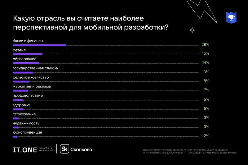 Самым многообещающим рынком для мобильных разработчиков оказался финансовый сектор (28%). В тройку лидеров вошли ритейл (15%) и образование (14%). Каждый десятый респондент наиболее перспективной нишей считает государственную службу.
