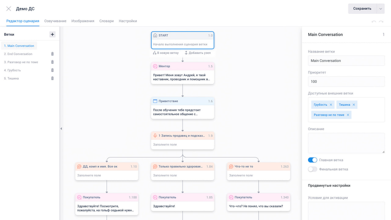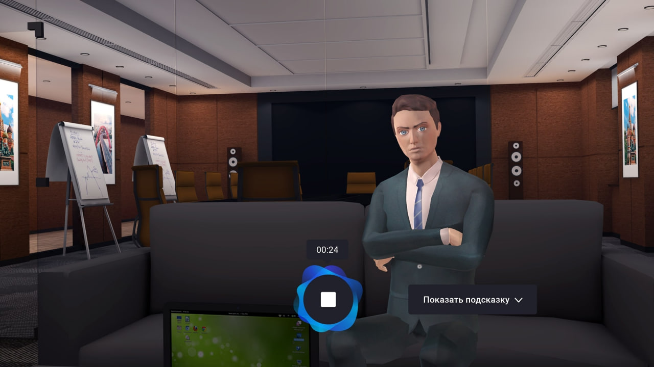 В диалоговых симуляциях коммуникативной мастерской пользователь может общаться голосом с виртуальными персонажами, которые реагируют на его речь и действия. Каждый этап разговора система обещает сопроводить советами. Кейсы разнятся от проведения совещаний, переговоров и сбора обратной связи до оттачивания клиентского сервиса, работы с возражениями и дополнительных продаж.