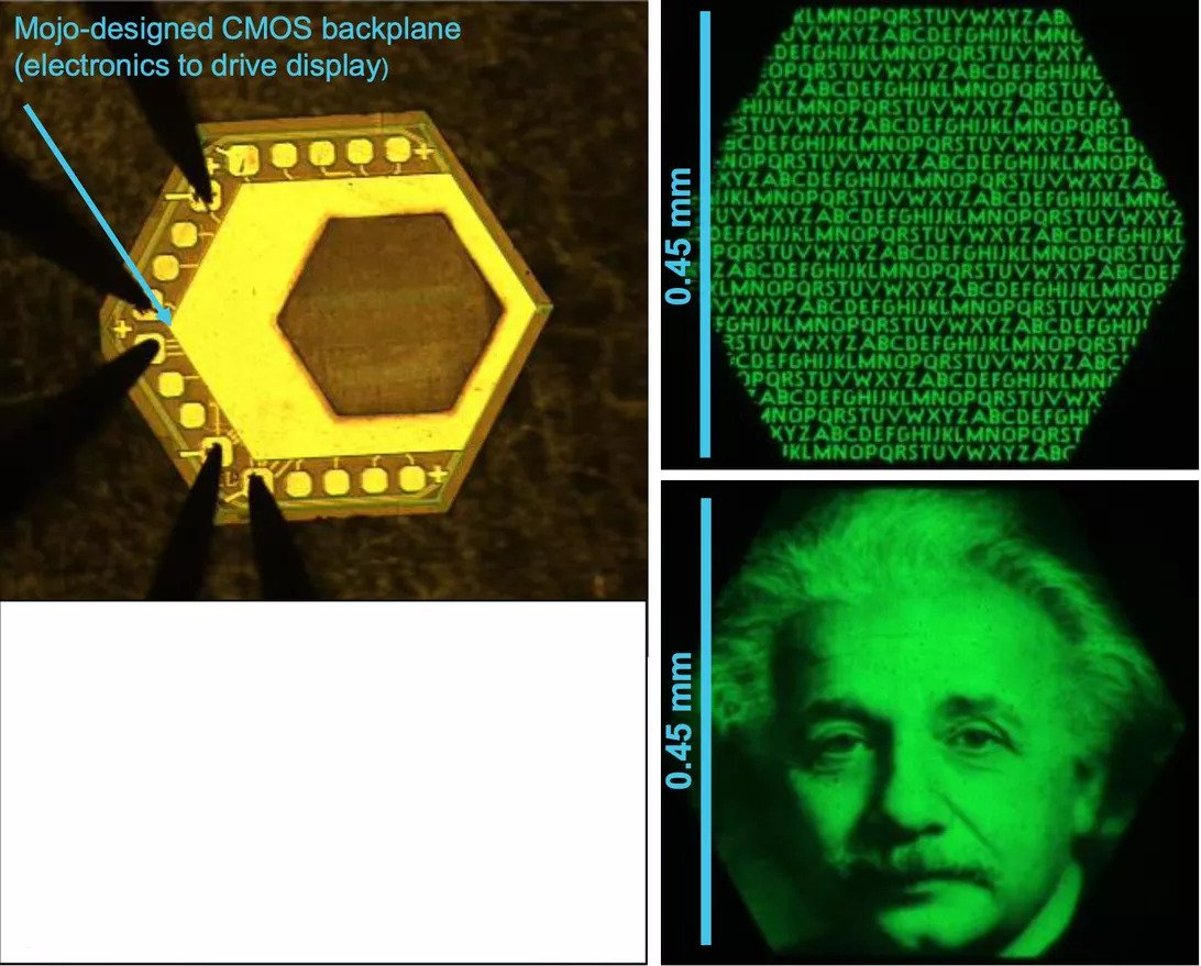Её центральным элементом является шестиугольный дисплей шириной менее полумиллиметра, каждый пиксель которого размером всего в четверть эритроцита, красного кровяного тельца, которое у человека имеет диаметр от 7 до 10 микрометров. Фемтопроектор, крошечная оптическая система, увеличивает воспринимаемые размеры изображения и направляет его на центральный участок сетчатки.