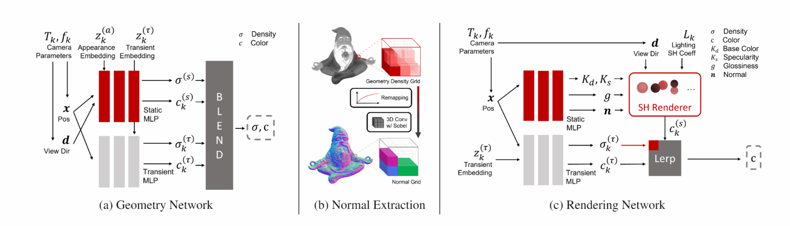 Наша двухэтапная модель использует в качестве входных данных изображения объекта в различных условиях. С позициями камеры на изображениях и масками переднего плана объекта, полученными другими современными методами, мы сначала оптимизируем геометрию сканируемого объекта и уточняем позиции камеры путём обучения сети на основе NeRF. Затем мы вычисляем нормаль поверхности из геометрии (представленной функцией плотности), используя наш слой извлечения нормалей. Наконец, наша модель второго этапа декомпозирует свойства материала объекта и определяет условия освещения для каждого изображения.