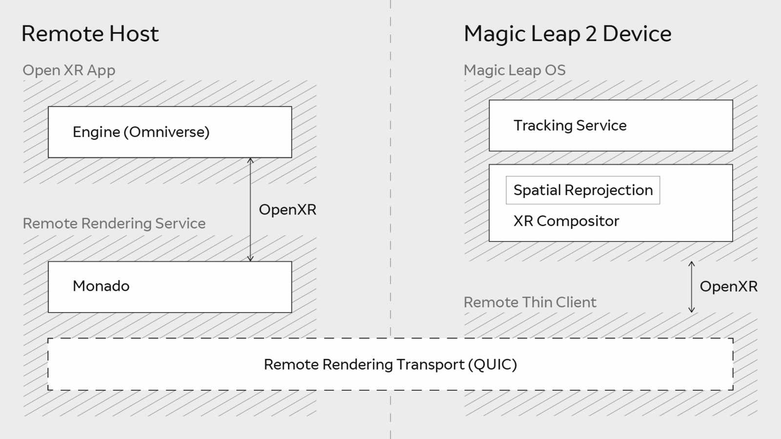 Стереоскопическая трансляция на очки включается одним нажатием кнопки просмотра в Magic Leap благодаря API OpenXR. Среда выполнения дистанционного рендеринга OpenXR на стороне сервера использует графические ускорители NVIDIA для компоновки и кодирования изображений. Затем Magic Leap 2 принимают их и декодируют, отправляя обратно информацию о позе, положении человека в пространстве и движениях его глаз. Результаты работы с USD-файлами других пользователей отображаются в сцене в реальном времени.