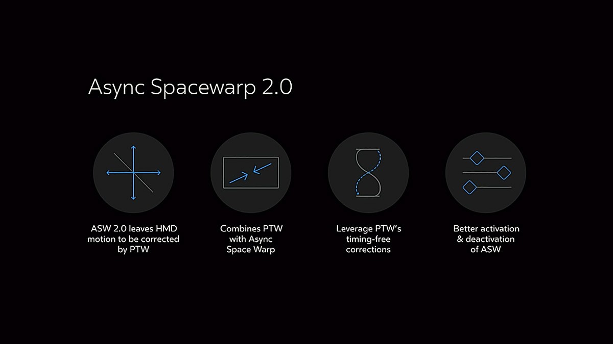 ASW 2.0 работает только на персональных компьютерах с очками Rift и будет работать с Rift S. ASW состоит из двух частей: Timewarp уменьшает задержку, а Spacewarp сглаживает смену кадров в случаях, когда приложение не может поддерживать стабильные 90 кадров в секунду, и даже позволяет слабому оборудованию запускать ВР-приложения со скоростью 45 кадров в секунду, добавляя сгенерированные на основе предыдущих кадры до приемлемой скорости. Например, если железо способно только на 80 к/с, решение первого поколения занизит их до 45 к/с и добавит 45 своих.